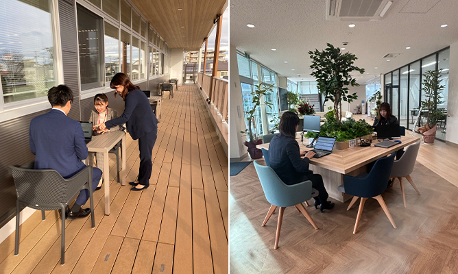 自然の光、風を感じながら「集中とリフレッシュ」を同時に得られるバルコニーエリア。テーブル中心部のシンボルツリーとたくさんのグリーンがあることでいつも緑に囲まれ、社員の充実感にも繋がっています。