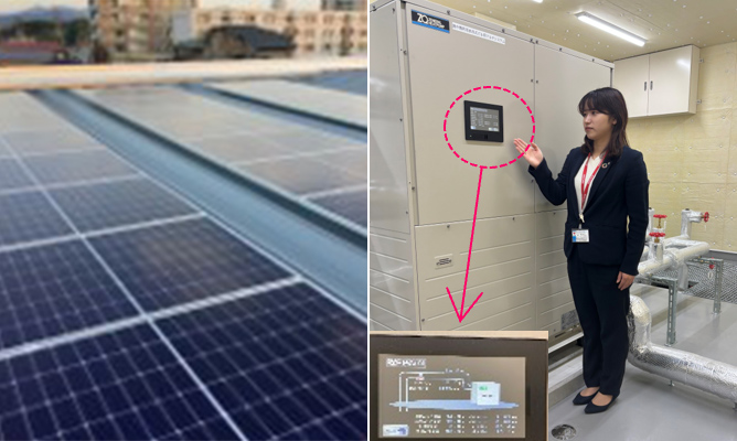太陽光発電+蓄電池による電力自家消費に加え、年間平均温度15℃の地中熱を空調に活用。「RICOH Smart MES*」でのデマンドコントロールにより消費電力量を抑制。CO2排出量の削減により脱炭素へ貢献しています。