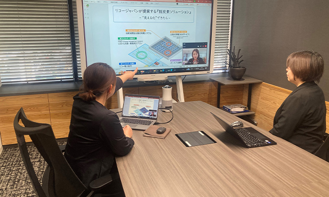 インタラクティブホワイトボード(電子黒板)やRICOH Meeting 360(WEB会議デバイス)を活用したコミュニケーションエリアを随所に設けています。