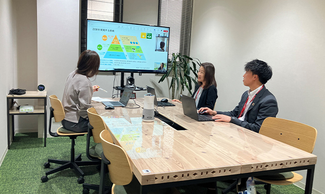 無機質になりがちなテレビ会議室には、宮崎県産の杉の端材からできた環境にやさしい積層集成材のテーブルを採用しています。杉の木のぬくもりと自然に近い色調で落ち着いた雰囲気です。
