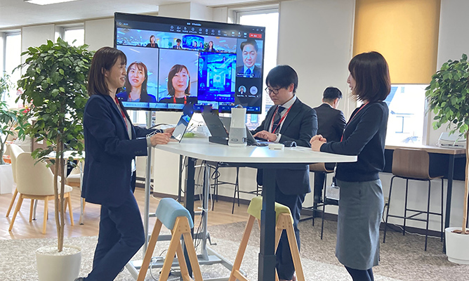 時間短縮で打合せ可能なオープンスペースを設置。リコーインタラクティブホワイトボード(電子黒板)やWeb会議システム(Microsoft Teams)を活用し、離れた拠点とも効率的な会議を実現しています。