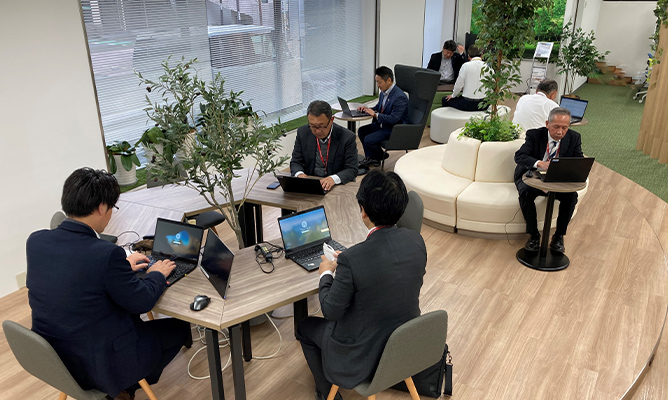 組織を越えたフリーアドレスを採用しています。リラックスした環境で組織間の会話も増え、良いアイデアがたくさん生まれています。ソファー席、ファミレススタイルの席、個人ブースなどオンライン環境も含めご来場時にはご体感頂けます。