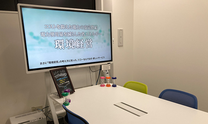 会議時間がずるずると延びていませんか?私たちは、砂時計と昇降式テーブルを活用しメリハリのあるミーティングを実現しています。更に、インタラクティブホワイトボード(電子黒板)で、遠隔地との会議も大画面で手軽に実施しています。