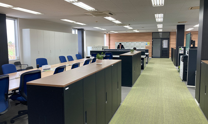 フリーアドレスを採用しています。当日の予定・仕事内容に応じて、“ソロワーク”、“チームワーク”が可能となるレイアウト配置を採用しています。活動全体の高効率化をすすめています。