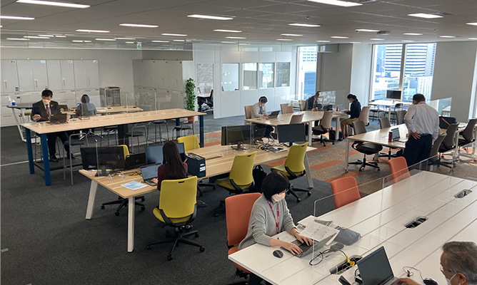 「外出前に短時間の作業をする時にはスタンディングスペース」「今日はオレンジの椅子!」など、業務や気分に合わせて場所を選択でき、生産性向上や社員満足度向上に繋がっています。