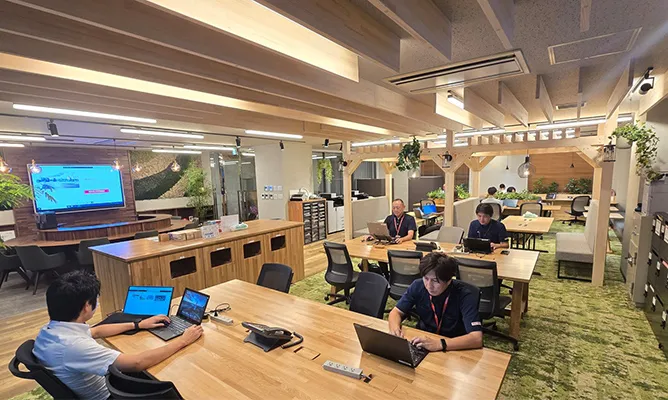 社員のアイデアを造作家具で実現し、「使う人と場所にフィットする家具」を形にしました。間伐材を再生した集成材を使用し環境にやさしいオフィスです。またフリーアドレスや昇降テーブルなどを導入し快適で柔軟な働き方を実践しています。