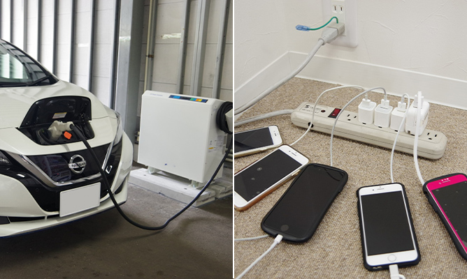 EV充電スタンドを介して、緊急時にはEV(電気自動車)を蓄電池として活用します。EV(電気自動車)に蓄電された電力は、社屋のBCP対策コンセントから、テレビやスマートフォンなどの電力供給源として、BCPにも活用しています。