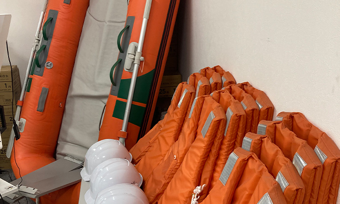 BCP対策として社員用ヘルメット、地震対策キット、保存食やボート・救命胴衣などを常備しました。緊急地震速報を傍受する仕組みも導入しました。今後は蓄電池の導入も検討しています。