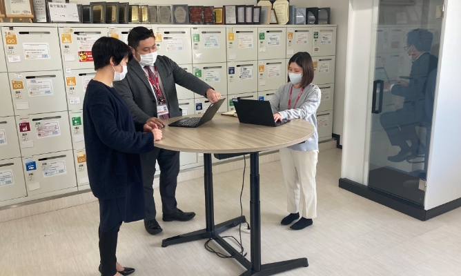 会議室以外の多様な打ち合わせスペース設置しています。短時間の打ち合わせは、円卓で顔を見ながら。遠隔での個人同士の会議は、モバイルパソコンやスマートフォンで Microsoft 365を活用して参加します。
