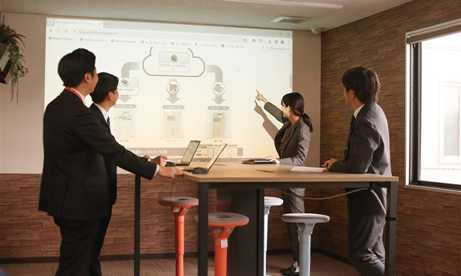 すぐに集まって打ち合わせできる立ちミーティングスペース。天吊りプロジェクターと100インチの大型スクリーンを設置しています。立ち座りしやすく、ゆらゆらできる遊びゴコロのある椅子で社員の健康にも配慮しています。