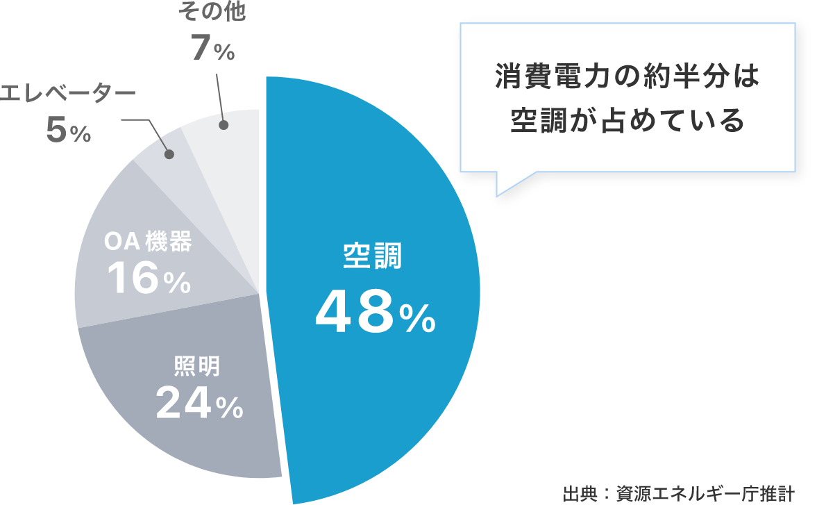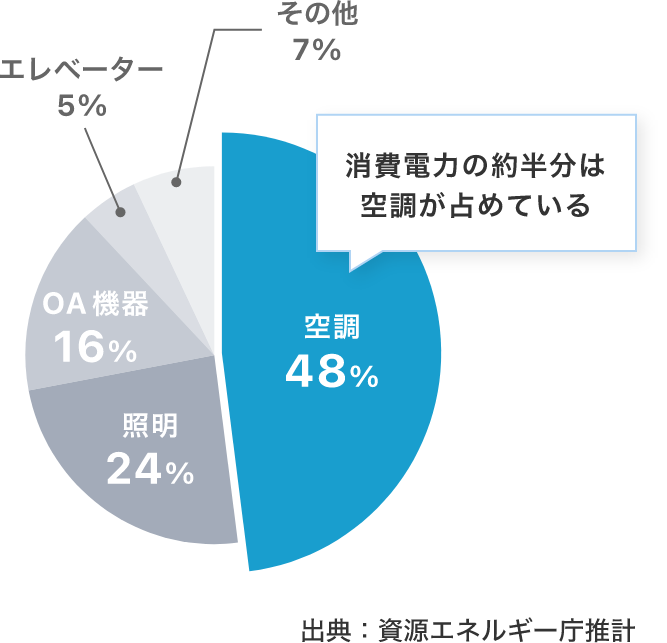 資源エネルギー庁によると、オフィスにおける消費電力量の約半分を空調が占めています。