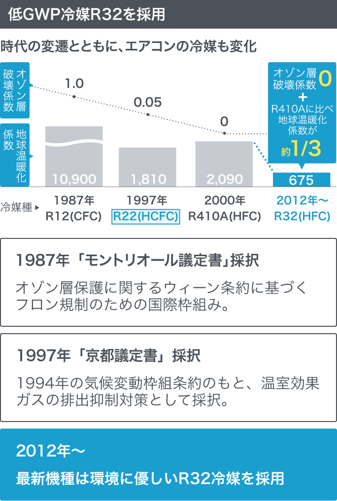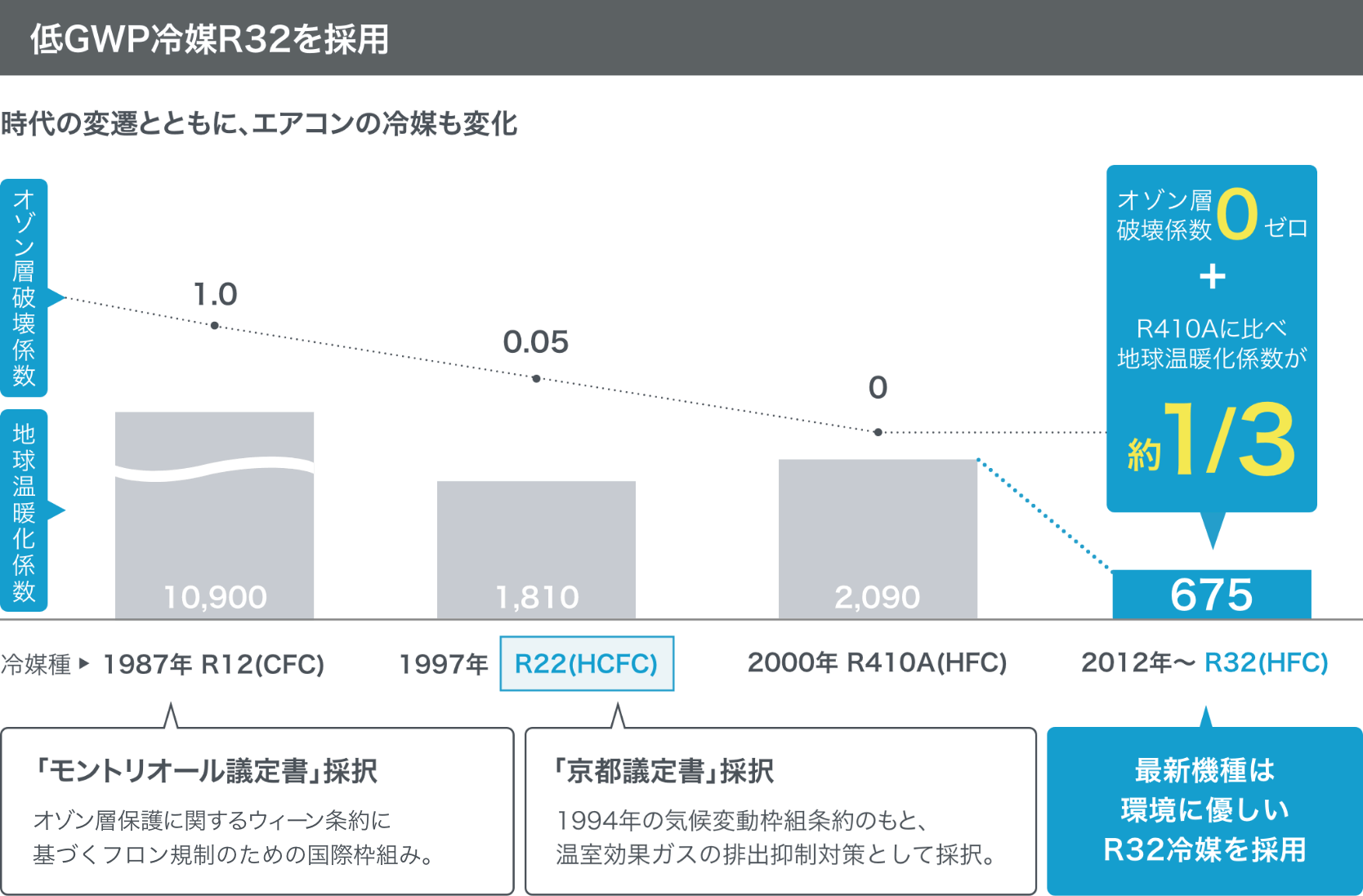 時代の変遷とともに、オゾン層破壊係数がゼロで地球温暖化係数がより低い冷媒への転換が進んでいます。