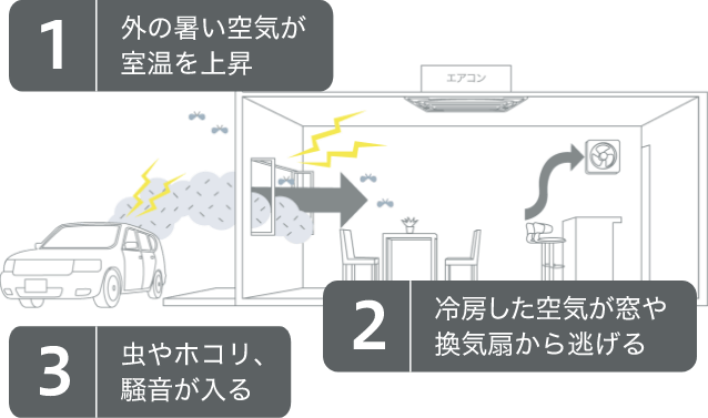 夏場は熱い外気が流入し、エアコンで冷やした空気が逃げ、冬場はエアコンで温めた空気が外に逃げ、冷たい外気が流入。室内の空気を快適な温度に戻すため、必要以上にエアコンが稼働してしまいます。また、窓を開けることで雨や虫、花粉、ホコリ、騒音などが入ります。