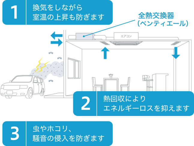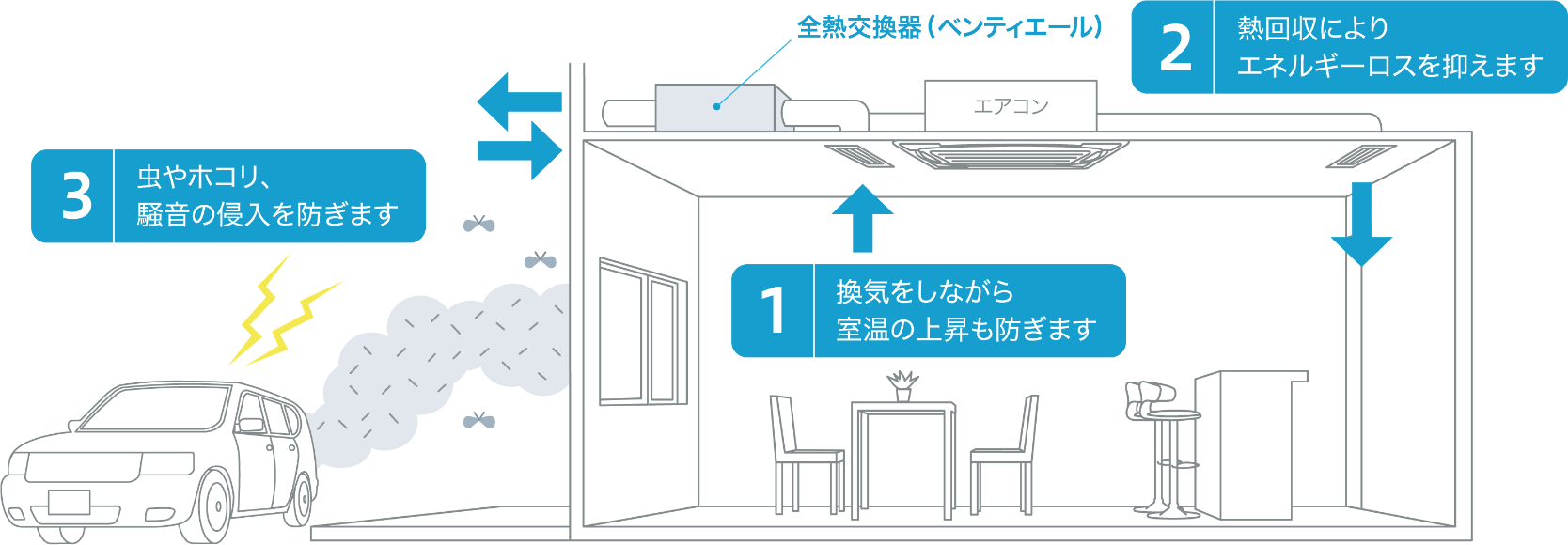 換気をしながら室温の上昇を防ぐことができ、かつ熱回収によりエネルギーロスも抑えます。また、窓を開けないので雨や虫、花粉、ホコリ、騒音などが入る心配もありません。