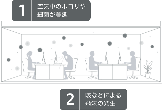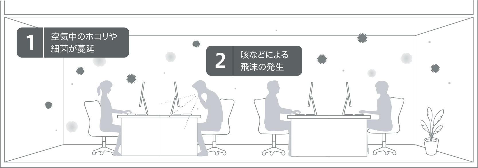 空気中のホコリや細菌が蔓延、咳などによる飛沫の発生。飛沫感染による感染症のリスクが高まります。