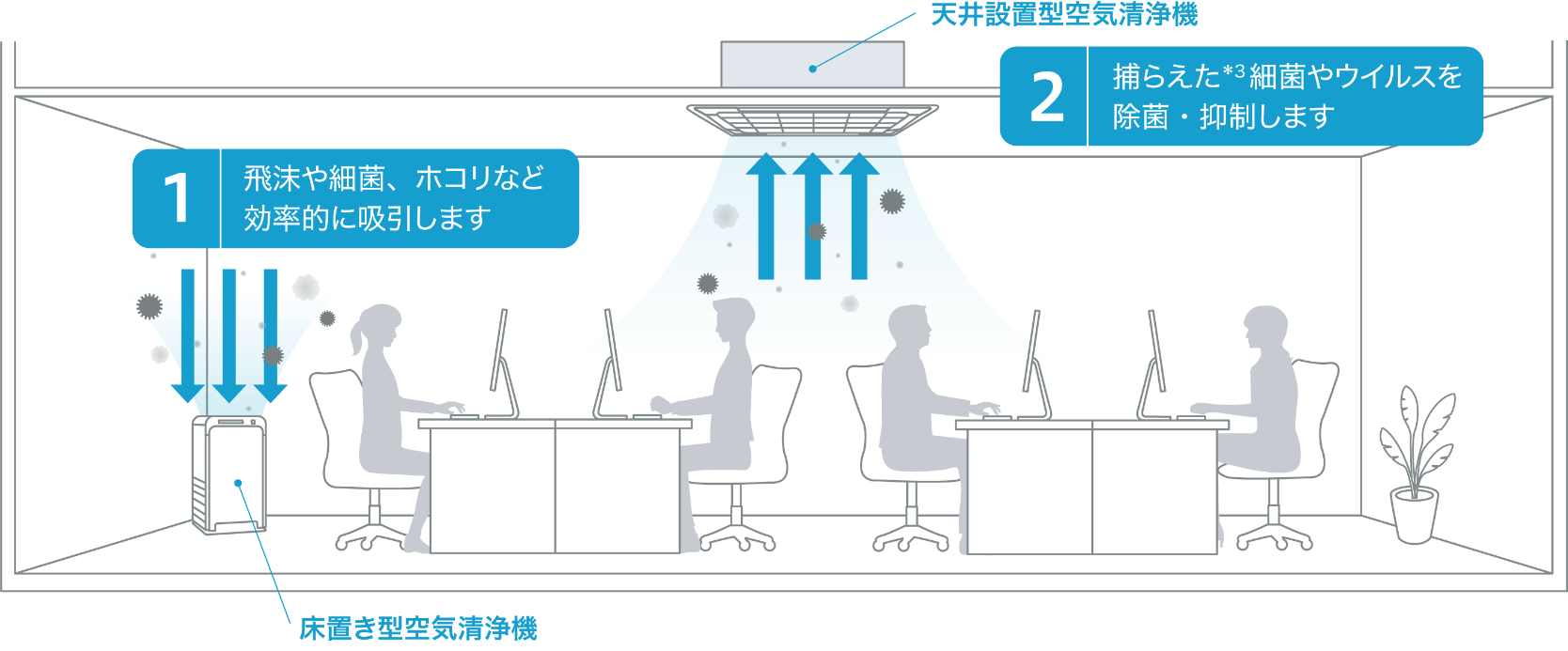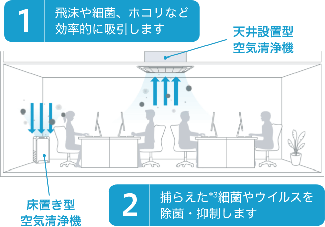 ホコリや細菌など浮遊する飛沫粒子を効率的に吸引。捕らえた注3細菌やウイルスを除菌、抑制します。
