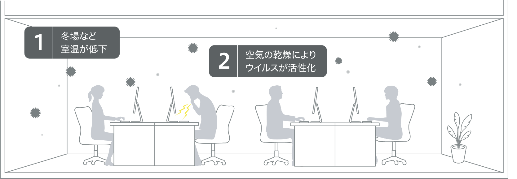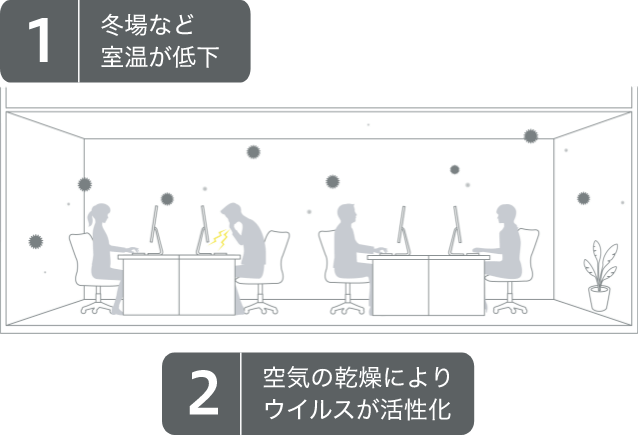 冬場の室温低下により、空気が乾燥しウイルスが活性化します。湿度が低いと体感温度がより低く感じられるため、エアコンを過剰に稼働させてしまいます。