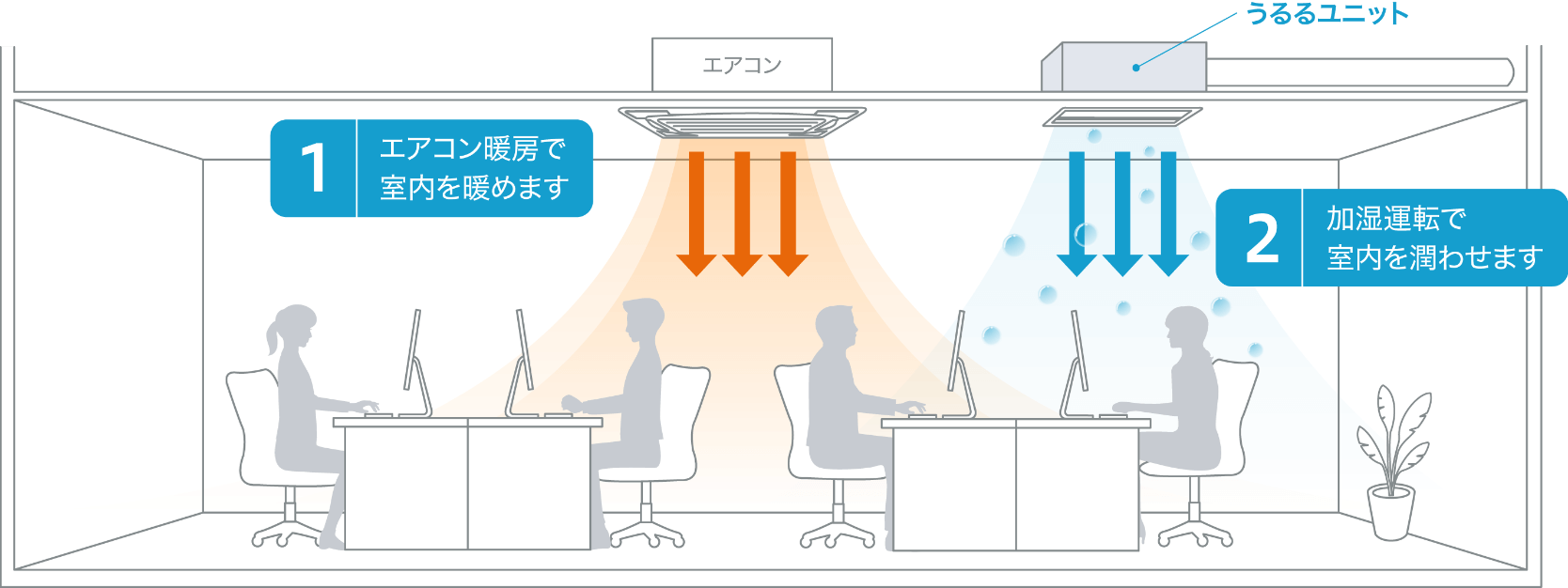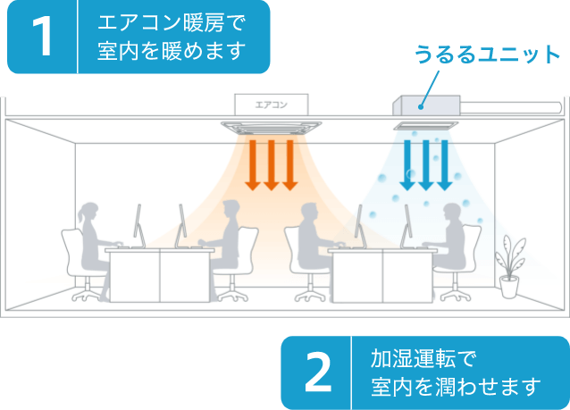 お使いのエアコン暖房と同時運転することで、室内を暖めながら潤いのある快適空間を保ちます。室内が潤うことでウイルスが繁殖しづらくなります。同じ室温でも湿度を上げることで暖かく感じられるので、エアコンの設定温度を控えることができます。