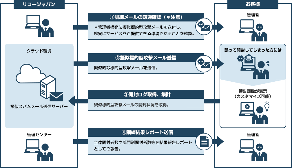 リコーは手軽にできるメール訓練サービスで、現状の従業員の皆様のセキュリティ意識レベルを可視化するお手伝いをいたします。