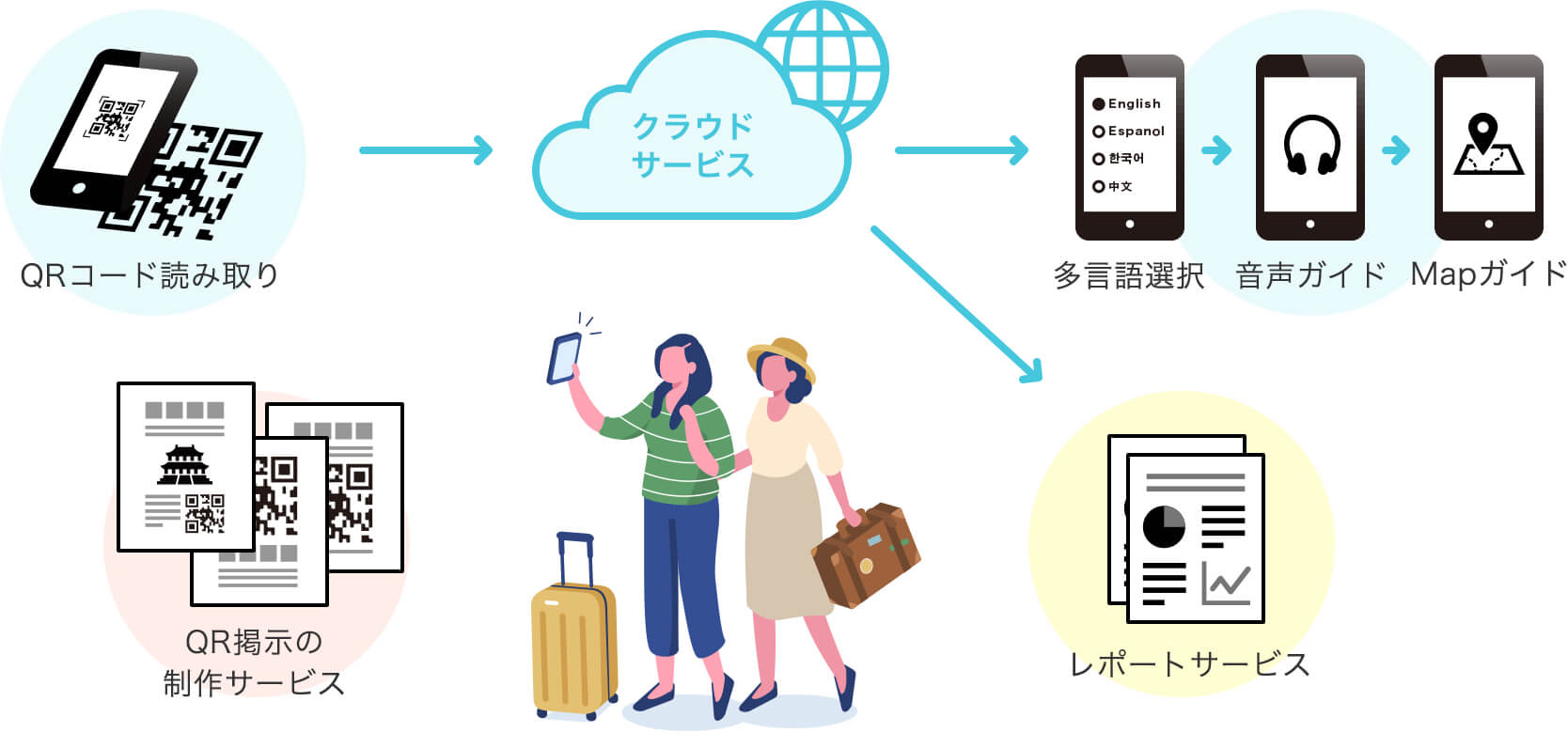 アプリケーションをインストールすることなく、QRコードを読み取るだけの簡単なクラウドタイプ多言語音声ガイド(約90カ国語対応)を、ワンストップでご提供します。