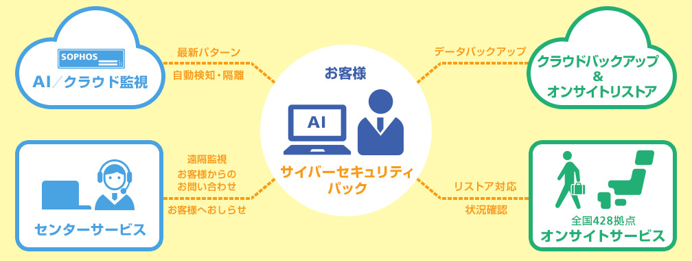 「RICOH サイバーセキュリティパック」は、日々増加するマルウェアの構造をAIが学習し、未知のマルウェアも確実に検知してデバイスの隔離やマルウェアの駆除までを自動で行うソフォスの次世代エンドポイントおよびネットワークセキュリティ技術と、お客様を24時間365日遠隔監視し、必要に応じてお客様先に駆けつけて障害復旧に対応するセンター&オンサイト保守を組み合わせたセキュリティサービスです。