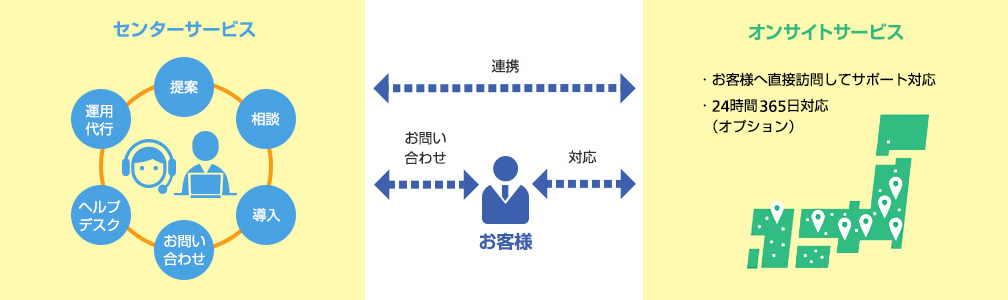 お客様のシステムの状態を常に監視し異常発生時にご連絡するサンターサービスと。全国拠点から導入設定、万一の場合リストア作業までご対応するオンサイトサービスで、お客様業務の安定稼働をご支援したします。