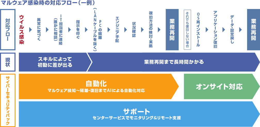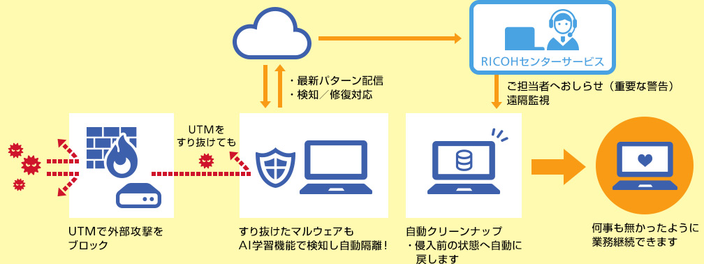 社員のパソコンがウィルスに感染した場合、発生から通常業務再開までは複雑で時間のかかる対応が必要です。業務の再開が、早期にてきることがもっとも重要です。リコージャパンの「RICOH サイバーセキュリティパック」なら、手のかかっていた煩雑なフローをAIにより自動で対応。AIの対応で復旧しない場合は、リコージャパンのカスタマーエンジニアが訪問*し、早期業務復帰をご支援しますので、お客様の手をわずわらせることが少なくなります。