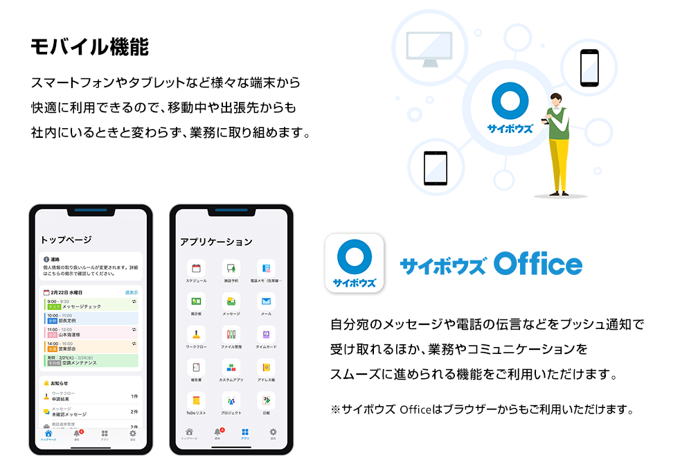 スマートフォンやタブレットなど様々な端末から快適に利用できるので、移動中や出張先からも社内にいるときと変わらず、業務に取り組めます。