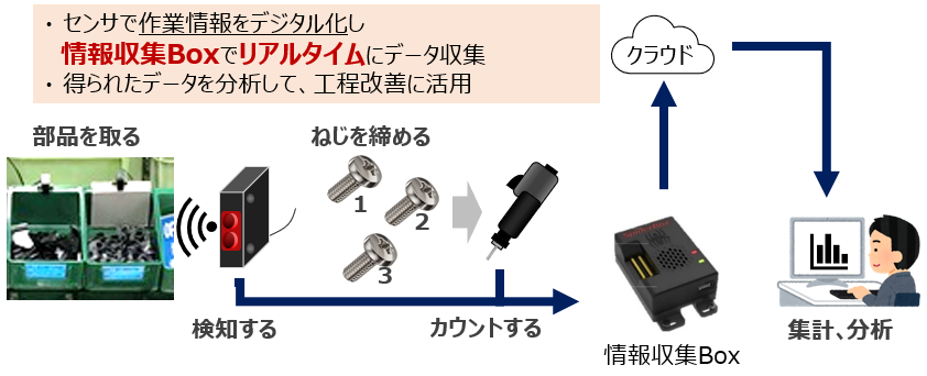 - 情報収集Boxは、工程に配置した各種センシングデバイス(デジタル温度計、カウンタ機能付きドライバ、etc.)からセンシングデータを取得することができます。