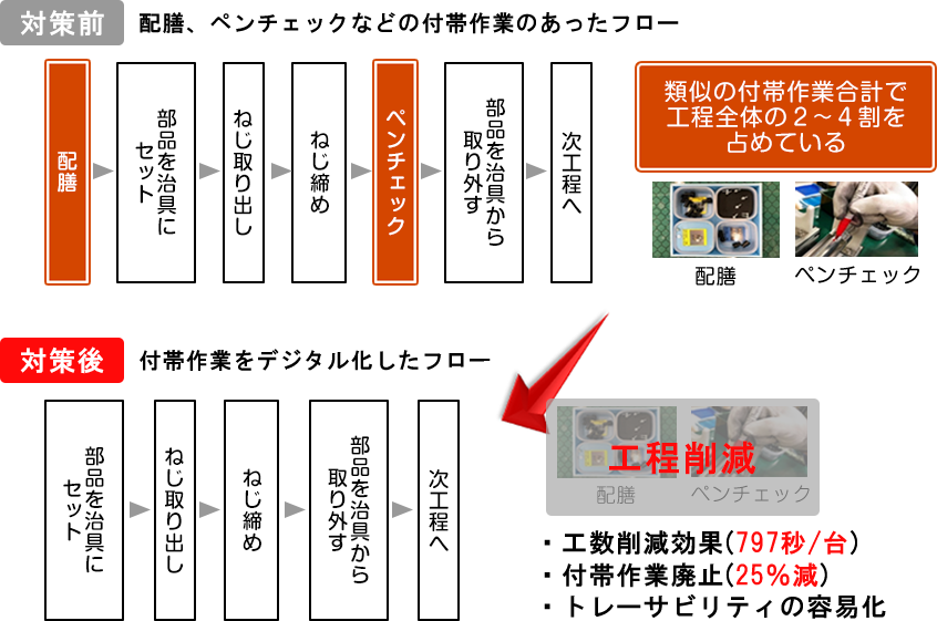 ねじ締め忘れした部品が後工程に流出してしまい、不具合が発生したり、流出防止対策として行っている組立部品の配膳や組立確認が煩雑になったりと、組付け工程では様々なトラブルが発生するという課題があります。本事例では、作業工程の情報収集をデジタル化し、現場の情報をリアルタイムで収集、得られたデータを分析に活用した改善をご紹介します。