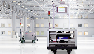 リコーグループでは生産現場での物流業務の改善施策の一環としてとして、『リコー 無人搬送車 M2』を開発し、社内実践を進めています。従来の磁気式無人搬送車(AGV)ではなく、光学式無人搬送車(AGV)のため、コストも手間もかかりません。
