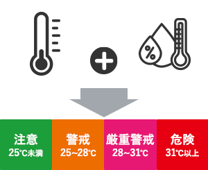 熱中症におけるリスクは必ずしも温度だけが要因という訳ではなく、湿度による影響も大きく受けます。そのため、熱中症リスクを回避するには室温だけを目安にするのではなく、WBGT値(暑さ指数)で管理する必要があります。