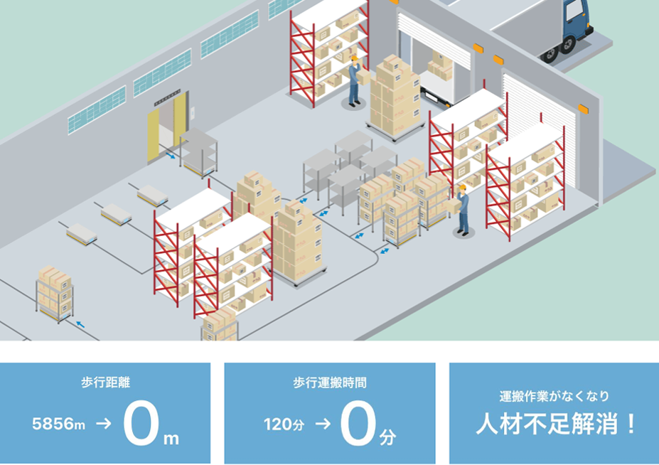 また、ある製造ラインでは、生産パーツ運搬時に、歩行運搬距離:5856m、運搬時間:120分を費やしていました。