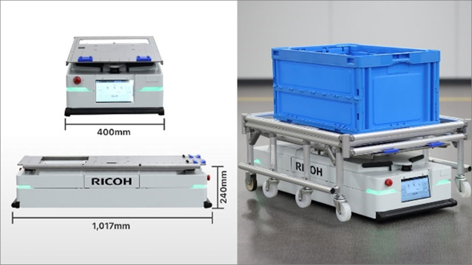 リコーのAGVは、床⾯のテープを認識、⾃動で⾛⾏し荷物を運搬する仕組みです(位置精度が⾼精度なガイド⽅式を採⽤)。