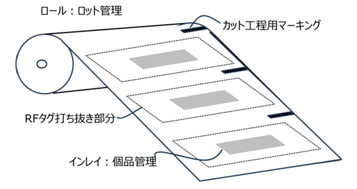 但し、この方法においても新たな問題が生じます。材料であるRFIDとリライタブルシートの単位の違いです。1枚のロール状のリライタブルシートがいくつもの製品になります。そのため、完成した製品が1枚のリライタブルシートのどの部分から使用されたものか分からいなため完全なトレーサビリティ情報を作ることができません。