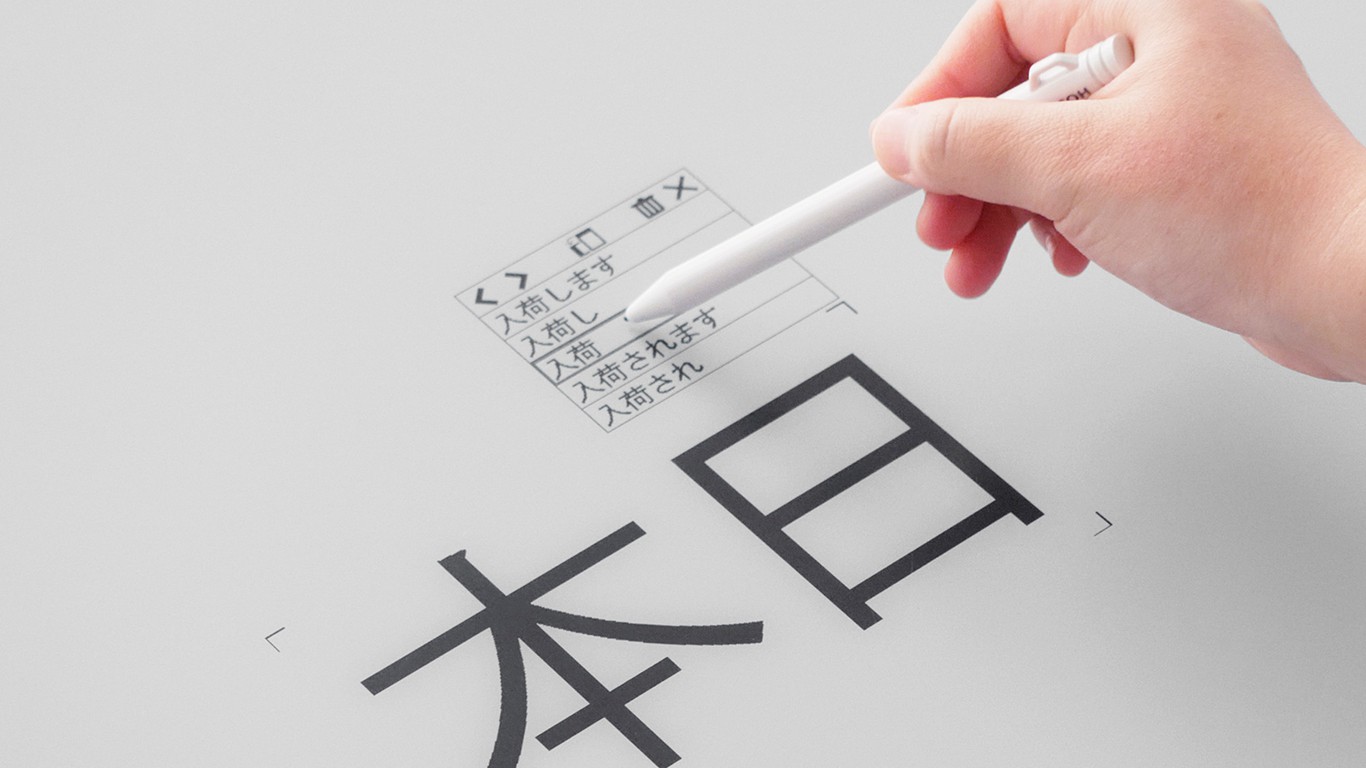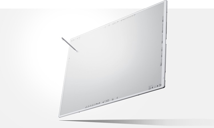 平置きして、机の上で使用できます。14.5㎜の薄型なので、机の上に置いても段差がなく、紙に書くのと同様の姿勢で、手をついて書けます。同梱の白いペン、オプションの黒いペン、2本で同時に書き込み可能。一つの机上で、書きあって作業できます。