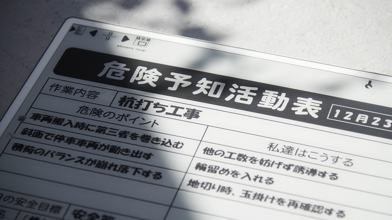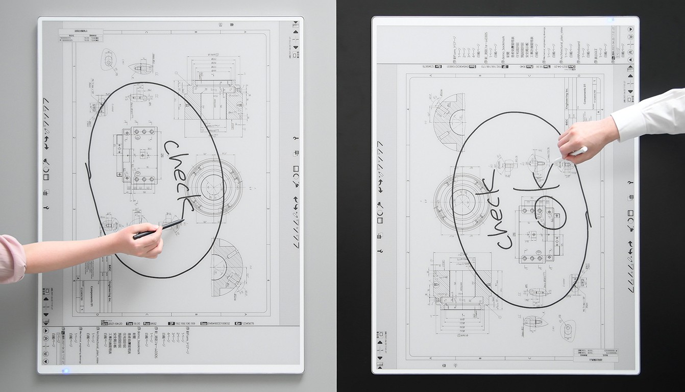 視野角が広いモノクロ電子ペーパーを採用。細かい図面、文字、線まできれいに表示。バックライトがないため、日光がまぶしい屋外でも画面がくっきり見えます。しかも、目に優しいブルーライトレス仕様。