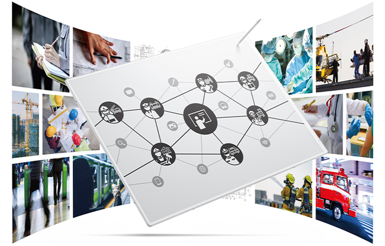 火災現場で指揮情報やトリアージ情報を整理・共有できます。風雨に晒される厳しい環境で大型電子機器の導入が難しい中、防塵防水のeWhiteboardによりスムーズに情報共有でき、伝達ミスを削減できます。