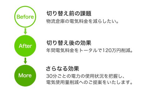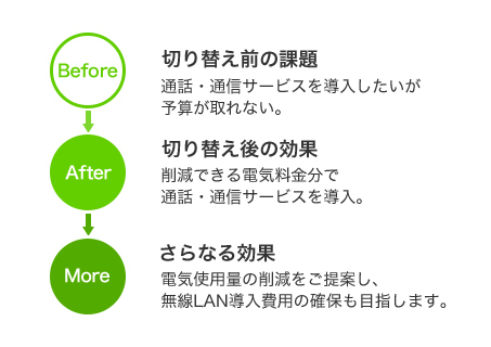 C社様は介護施設の空調設備に大きな電気料金がかかっており、コスト削減の方法を検討していました。リコージャパンの電力販売サービスに切り替えることで電力料金が低減でき、EMSの導入により電気使用量を抑えることで、さらなるコストの削減効果を検証され、リコージャパンの電力販売サービスとEMSを導入されました。導入後、年間電気料金をトータルで67万円削減。電気使用量を減らすことでCO2排出量を削減し、適切な温度管理による快適な環境を実現します。