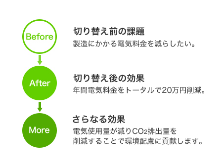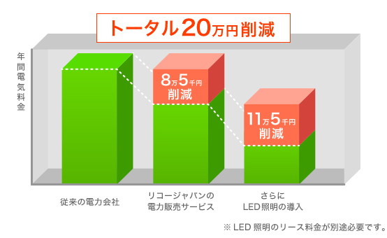B社様は製造にかかる電気料金の見直しを図るため、リコージャパンの電力販売サービスへの切り替えを検討されました。切り替えのみ行なった場合と、さらに工場で使用する照明をLED照明に変えた場合の2つのケースの効果を検証された結果、新電力とLED照明を組み合わせて導入されました。導入後、年間電気料金をトータルで20万円削減。電気使用量が減り、CO2排出量が削減されることで、環境配慮にも貢献いたします。