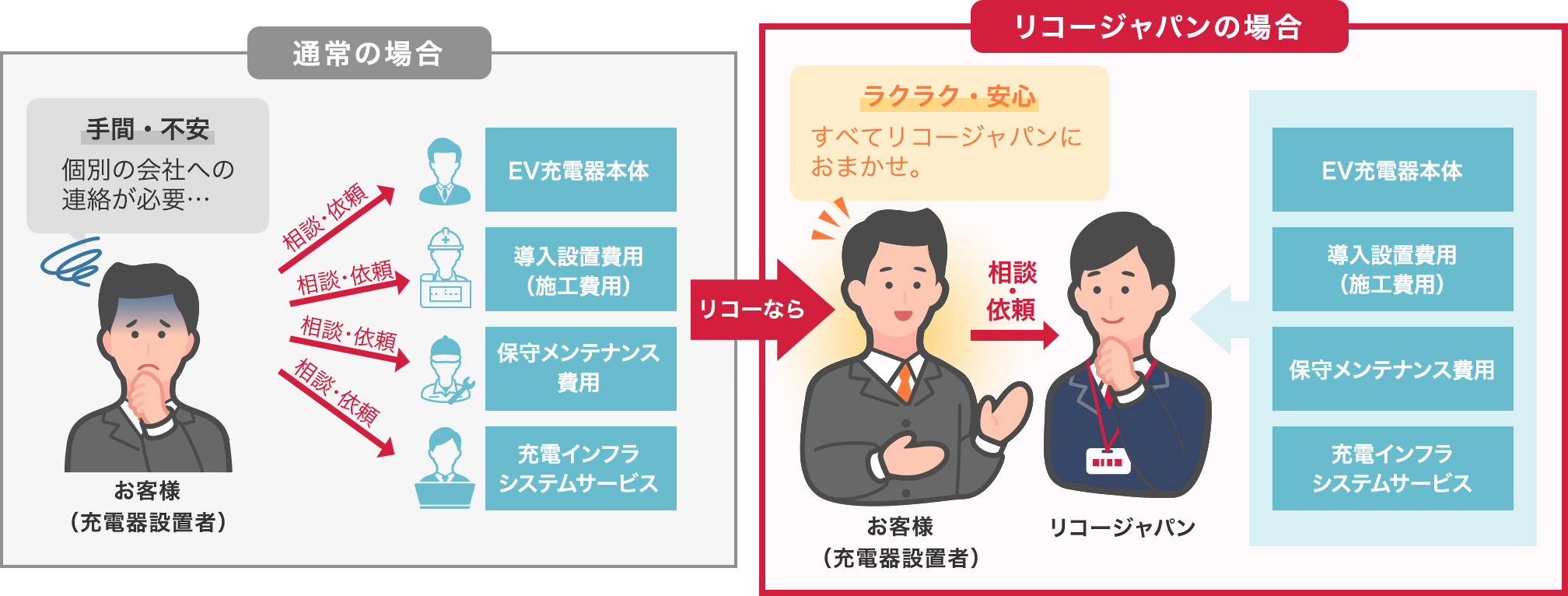 リコージャパンでは、脱炭素社会の実現を目的としたEVの導入を促進するため、お客様に最適なEV充電器の販売から施工、運用、保守までトータルにサポートいたします。
