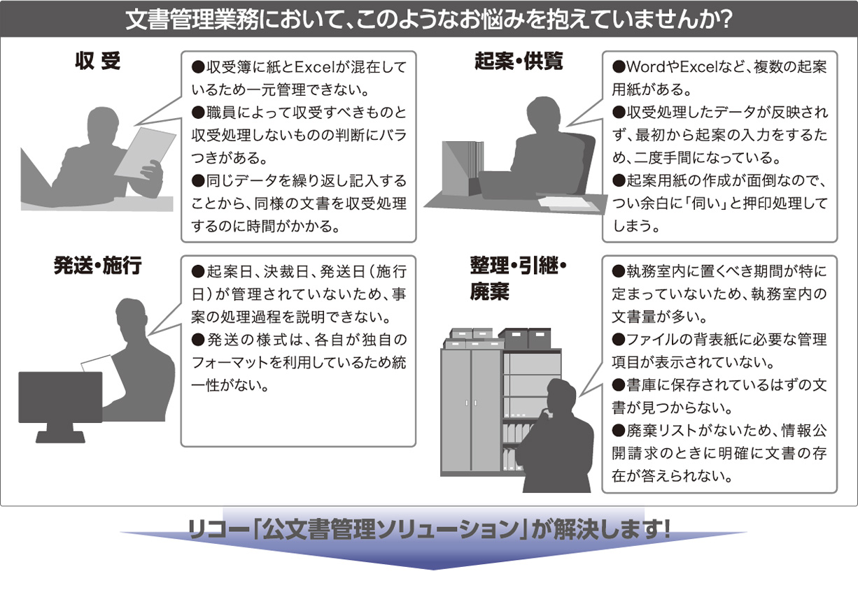 リコー「公文書管理ソリューション」は、お客様の現状の文書管理業務を見直し、システムで解決する部分と新ルールを定める部分を提示。 システムは、株式会社フォーズィーコーポレーション社の「File Life Station2」をご提供します。文書管理業務の効率化と文書管理の適正化を実現し、お客様のお悩みを解決いたします。