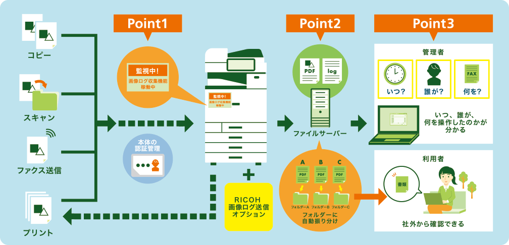 RICOH 画像ログ送信オプションは、「ファクス発注業務の効率化」と「ドキュメントのセキュリティー強化」のニーズを解決する画像ログ出力アプリケーションです。送信した紙のファクス文書を自動的にデータ化し、操作した結果を画像ログとして簡単に保存&共有することが可能。操作したログも把握できるなど、情報漏洩の対策にもご活用いただけます。