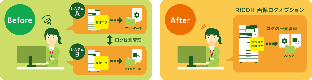 これまで操作ログと画像ログは別々のシステムが必要でした。またログ保管先もシステム毎に違っていたため一元管理ができませんでした。RICOH 画像ログ送信オプションでは同じフォルダーに保存されるので、ログの一元管理が可能となります