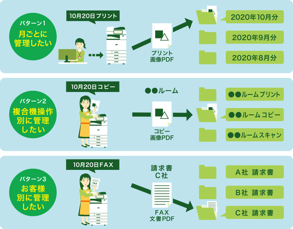 年や月、日ごとに管理したい場合、機器ごとに管理したい場合、お客様別に管理したい場合など、管理の方法はお客様によってまちまちです。RICOH 画像ログオプションでは、様々な要素や組み合わせでファイルやフォルダーをカスタマイズすることが可能です。