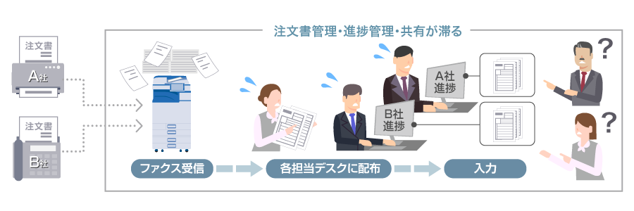 取引先から送られてきた注文書のファクスを各担当者に配布するため、配布漏れや確認の遅れが発生する場合があります。また、各担当者はデスクで紙の注文書を見ながら受注状況を手入力する必要があり、受注状況の共有が遅れてしまうこともあります。