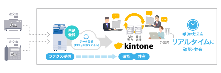 複合機で受信したファクスは、自動的にPDFまたは画像ファイルとして登録され、そのままkintoneに共有されます。これにより、ファクスの配布や担当者による手入力が不要となり、受注状況をリアルタイムで確認・共有できます。