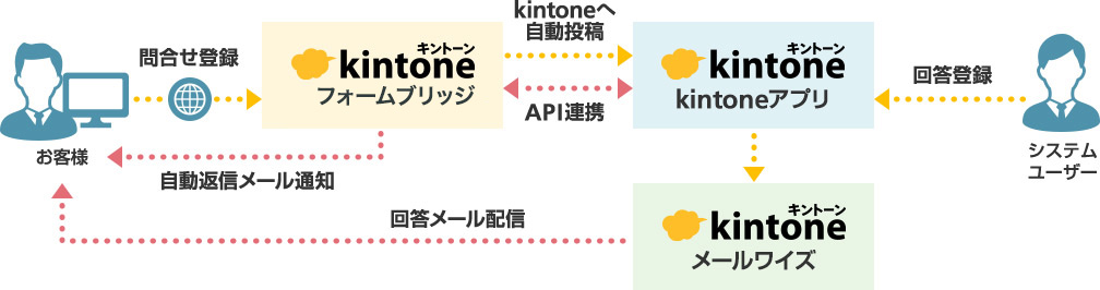 フォーム生成から顧客対応まで、Webサイトからのお問い合せを一元管理する仕組みを、kintoneで構築することが可能です。問い合せごとの対応状況も一覧でわかりやすくなるため、対応漏れ・二重対応がなくなります。お問い合わせの月次報告書も簡単に出力可能です。