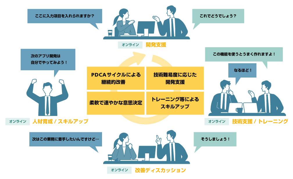 お客様が主体となって、アプリ作成をご支援いたします。