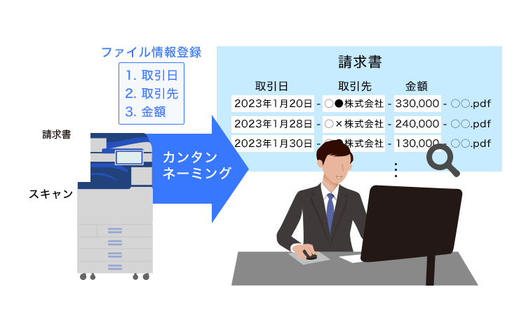 保管したい定型文書を、複合機でスキャンするだけ。パネル操作でのファイル名設定やパソコンによるリネーム作業も不要で、だれでも簡単にルール通り電子保管し、検索・共有も容易になります。